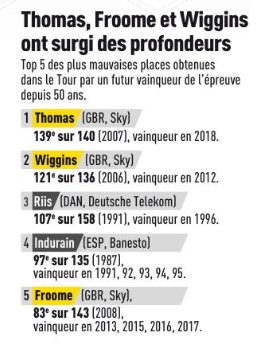 Curiosamente, Froome sólo aparece 1 vez. Otros corredores que el acervo popular sitúa cerrando pelotones, como Pereiro, Horner o Armstrong en sus primeros años, directamente no aparecen en esta clasificación. El gallego se estrenó con un prometedor 11º puesto en su primera gran vuelta, el Giro de 2002. Armstrong sólo logró terminar el Tour una vez en sus años pre-transformación, con un 36º puesto. Horner por su parte debutó en las grandes vueltas con nada menos que 33 años, siendo su peor resultado el puesto 63º (Tour de 2006).